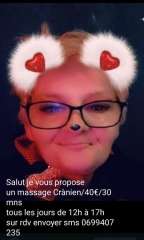 Coucou c'est Coralie je suis masseuse professionnelle je vous propose un massage complet avec huile ou crème tout dépend de ce que vous préférez plus un massage érotique je vous reçois dans un endroit très propre à l'abri de tout regard je suis une femme très douce très agréable et surtout professionnelle si vous désirez passer un moment agréable à ma compagnie si vous désirez passer un agréable moment à ma compagnie n'hésitez pas à me contacter j'espère vous dire à très bientôt et très bonne année à vous tous tous mes vœux de bonheur